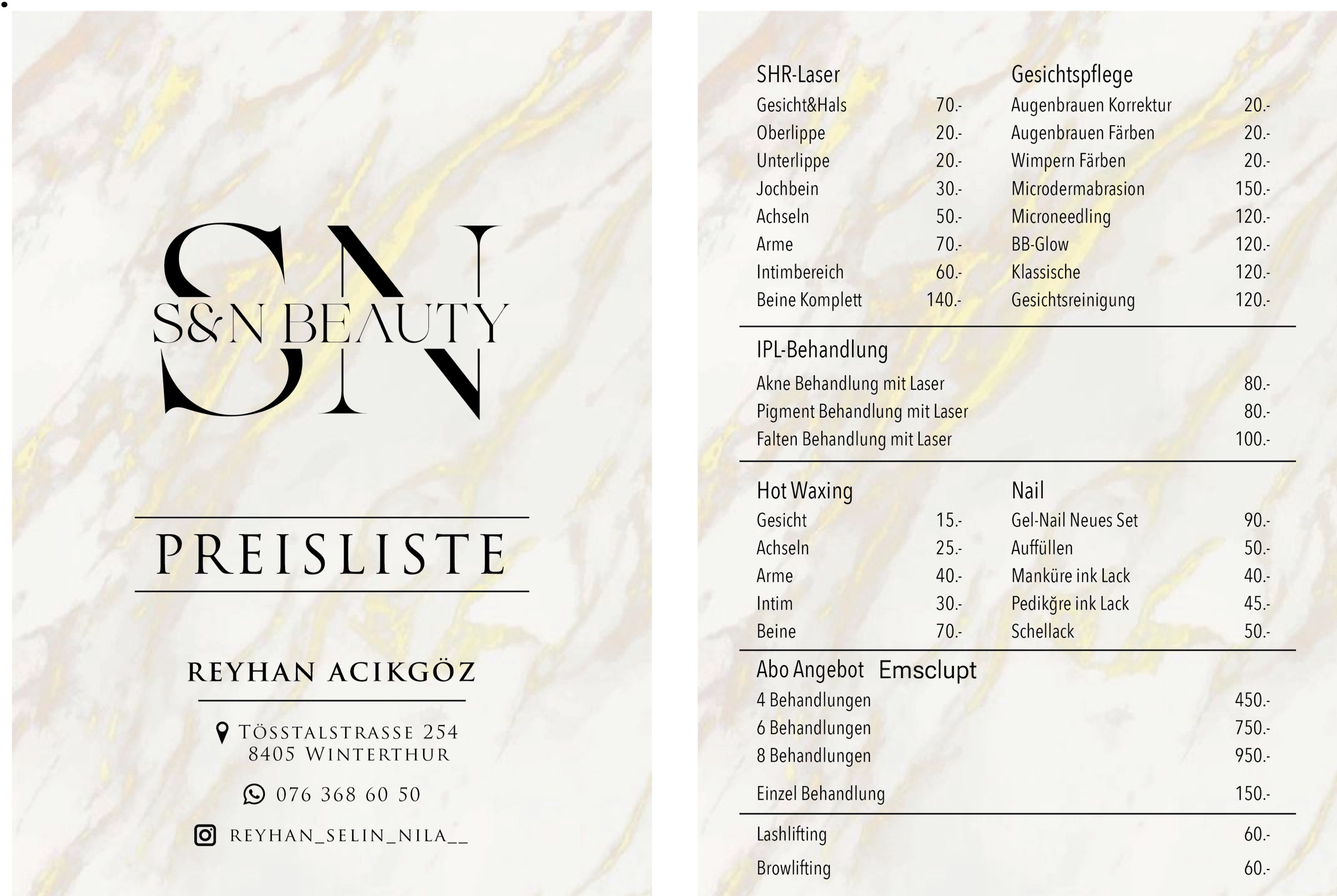 Bei S&N BEAUTY stehen Hygiene und Kundenzufriedenheit an erster Stelle. Unsere Behandlungen werden von erfahrenen Fachleuten durchgeführt, die darauf bedacht sind, Ihre individuellen Bedürfnisse zu erfüllen. Ich biete eine Vielzahl von Dienstleistungen an, darunter Laser-Haarentfernung,Gesichtsbehandlungen, Waxing, Lashlifting, Browlifting und Nagelpflege, die alle darauf abzielen, Ihr Wohlbefinden zu steigern und Ihre natürliche Schönheit zu unterstreichen.